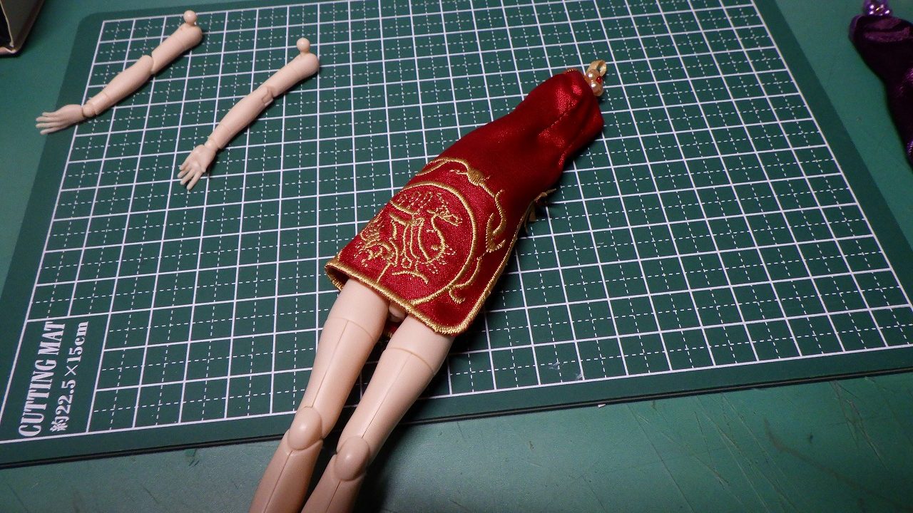 チャイナドレスは立体縫製であるのですがくびれ部分のサイズがタイトで付属の素体でギリギリ通る仕様で服を破いてしまわないか心配になりました。刺繍の模様はキレイ!